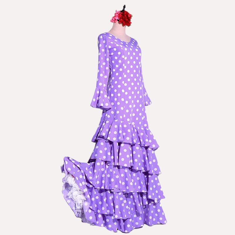 フラメンコ 長袖ワンピース 衣装 紫/白 水玉 1008