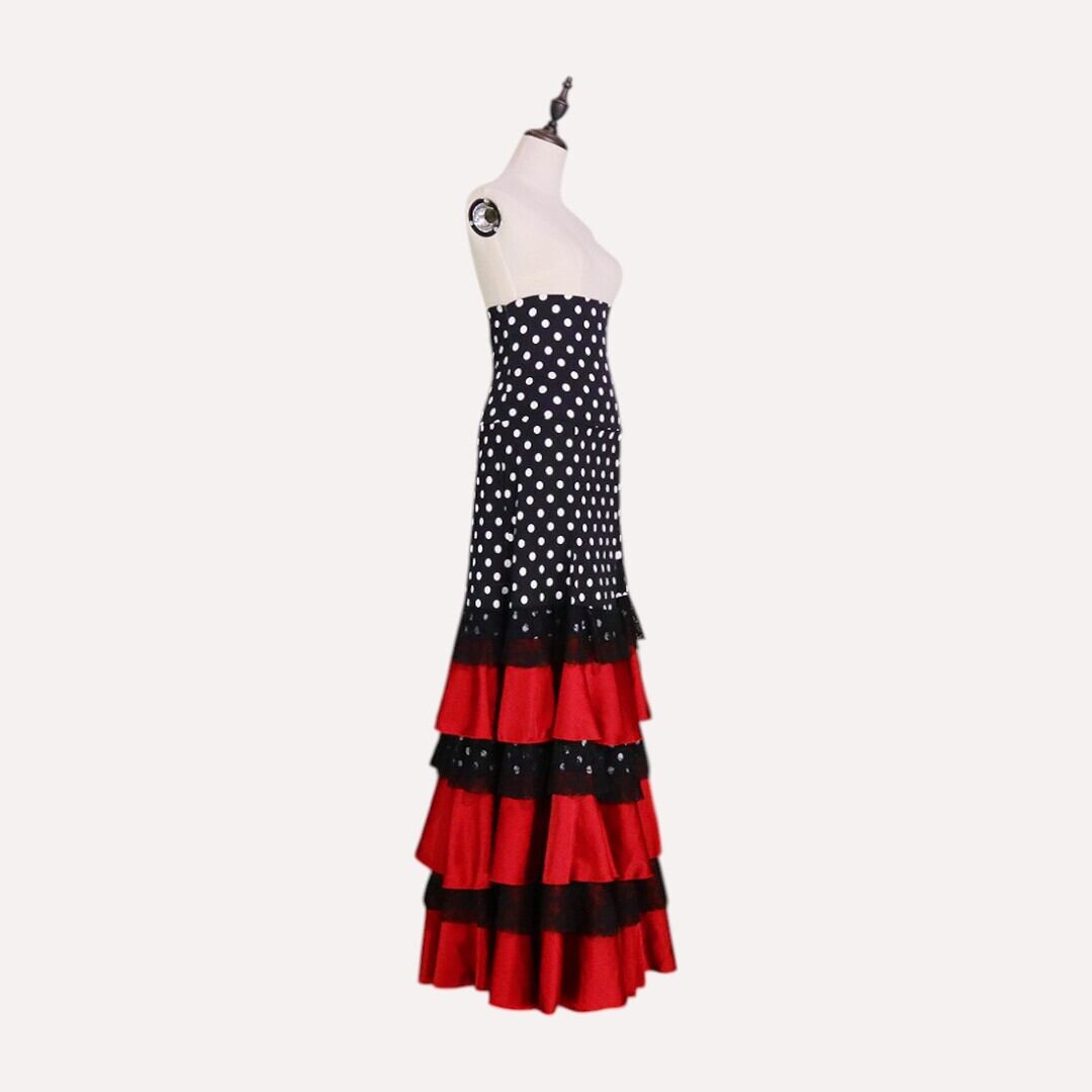 黒地に白の水玉模様と赤の3段フリルが印象的なフラメンコファルダ
