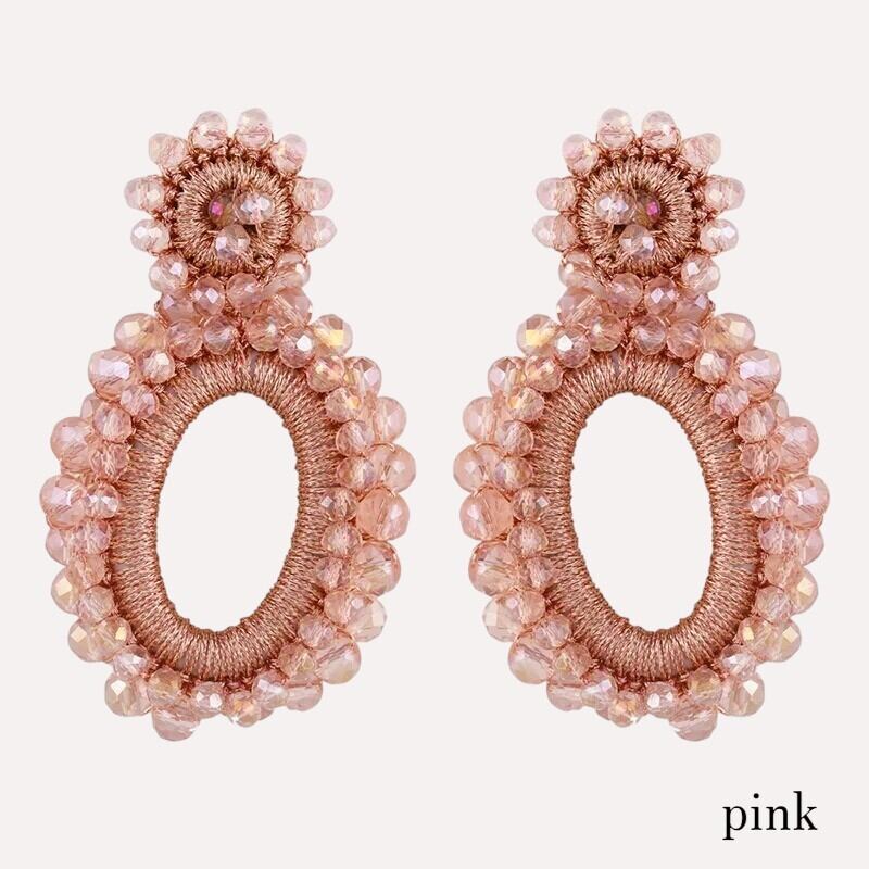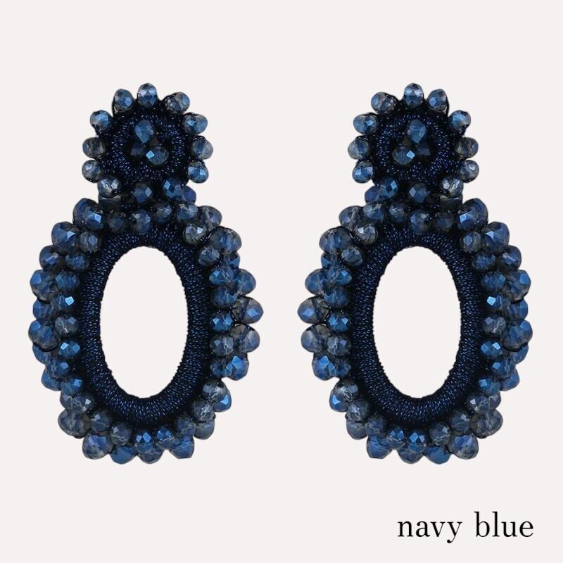 中央のオーバル型の輪郭を、丁寧に編み込まれたコードとビーズが縁取り、華やかな印象を与えます