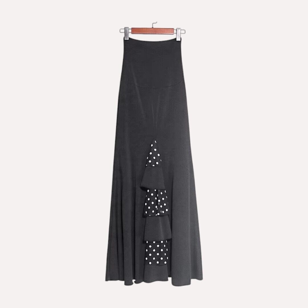 上品なブラックのベースに、裾の一部にあしらわれた黒地に白い水玉模様のフリルが印象的