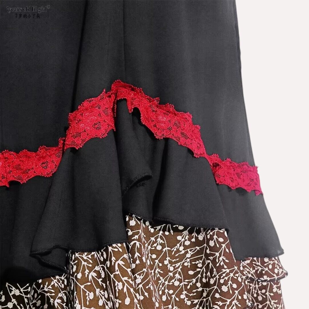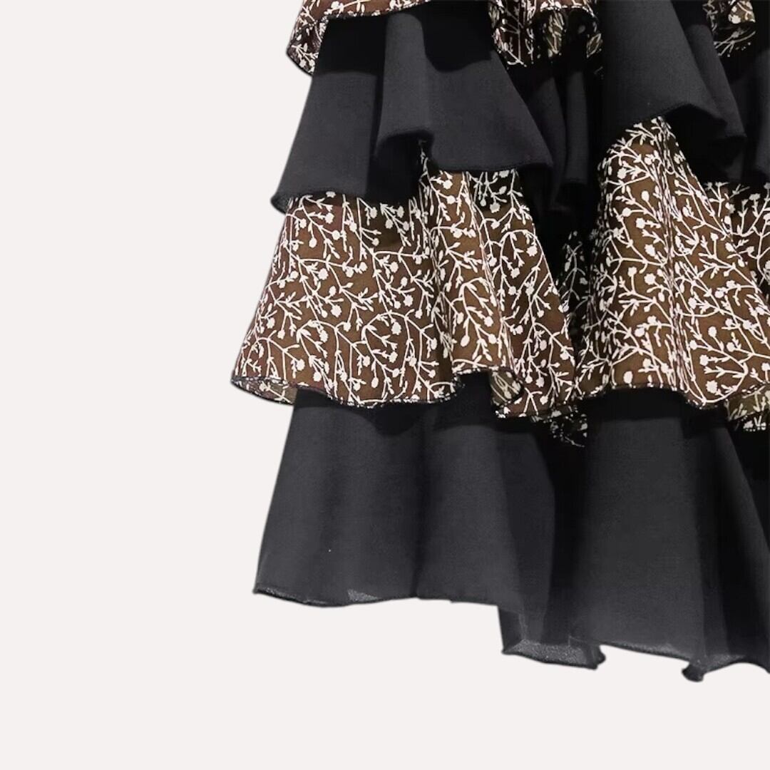 シックな黒のトップス部分と、エスニック調のプリント生地のティアードフリル