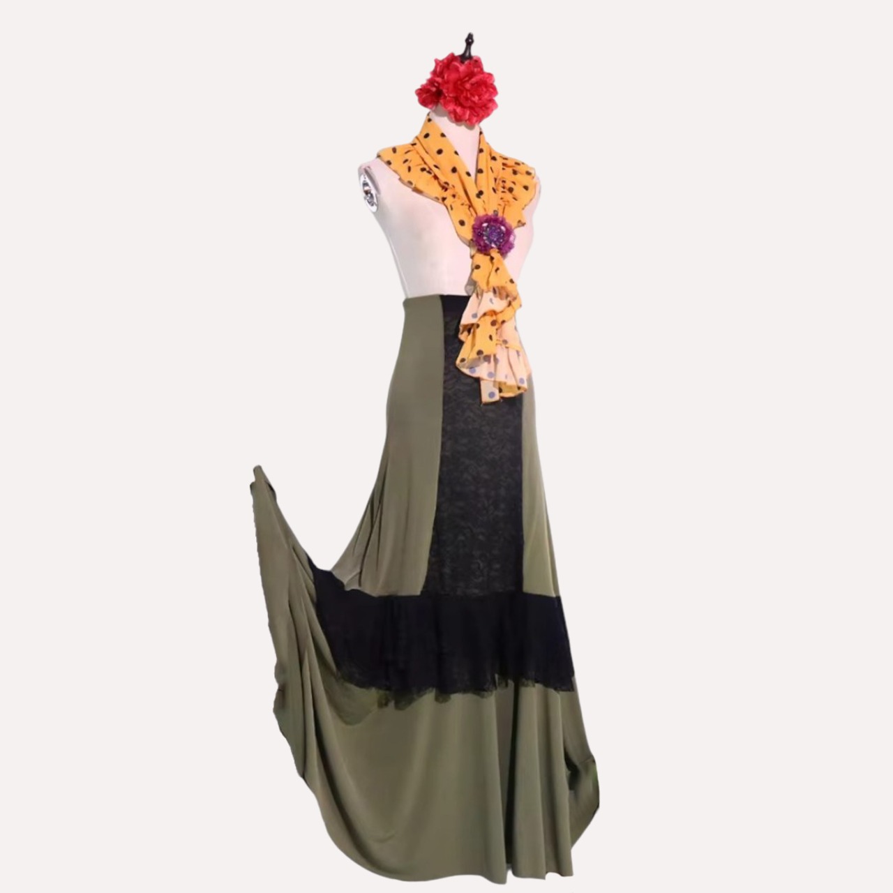 フラメンコ ファルダ 衣装 オリーブグリーン 黒 レース 1235