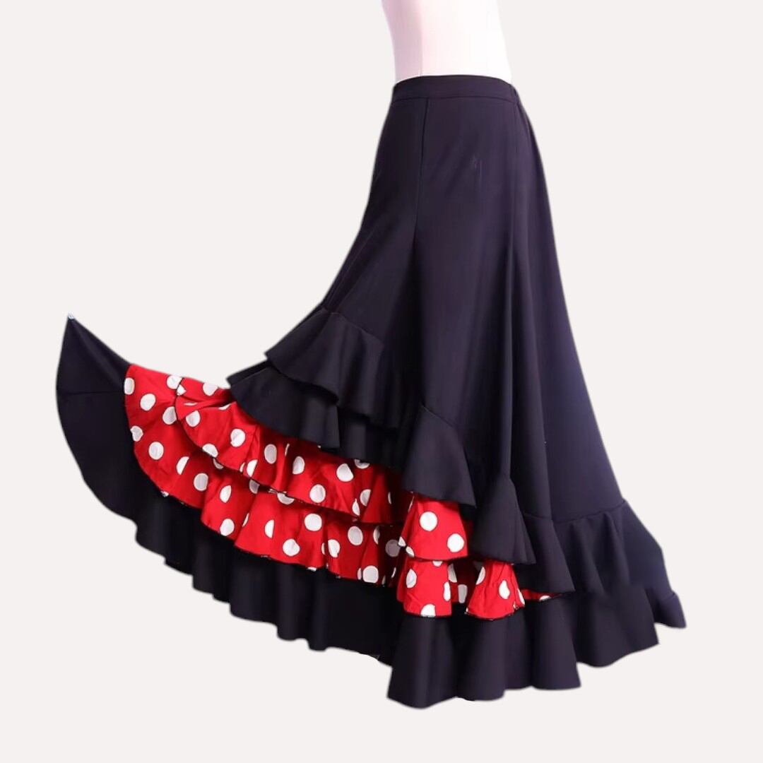 シックなブラックをベースに、内側のフリルに情熱的な赤地に白い水玉模様があしらわれたファルダ