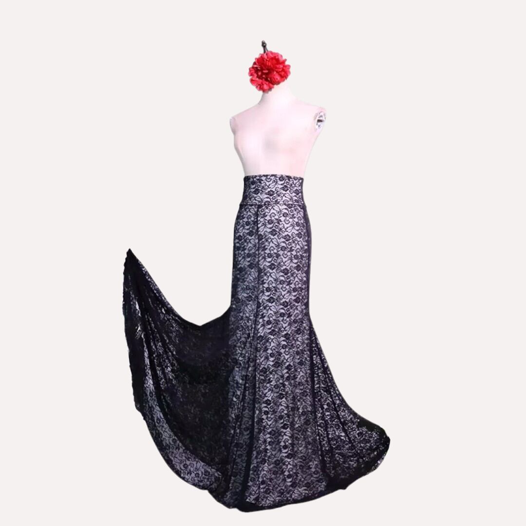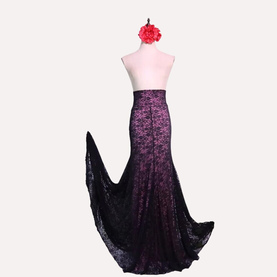 深みのあるパープルカラーの生地に、繊細なブラックレースが重ねられたファルダ