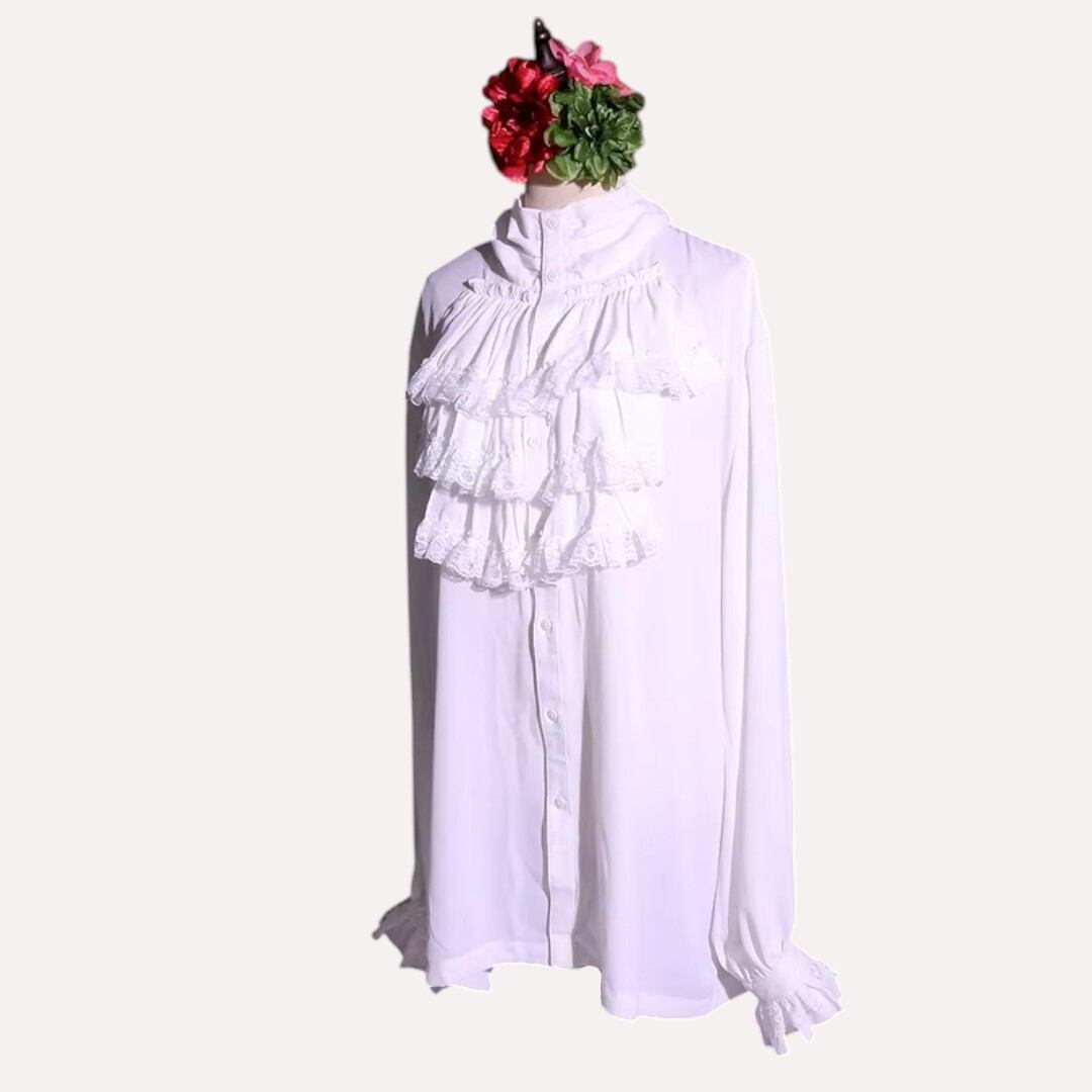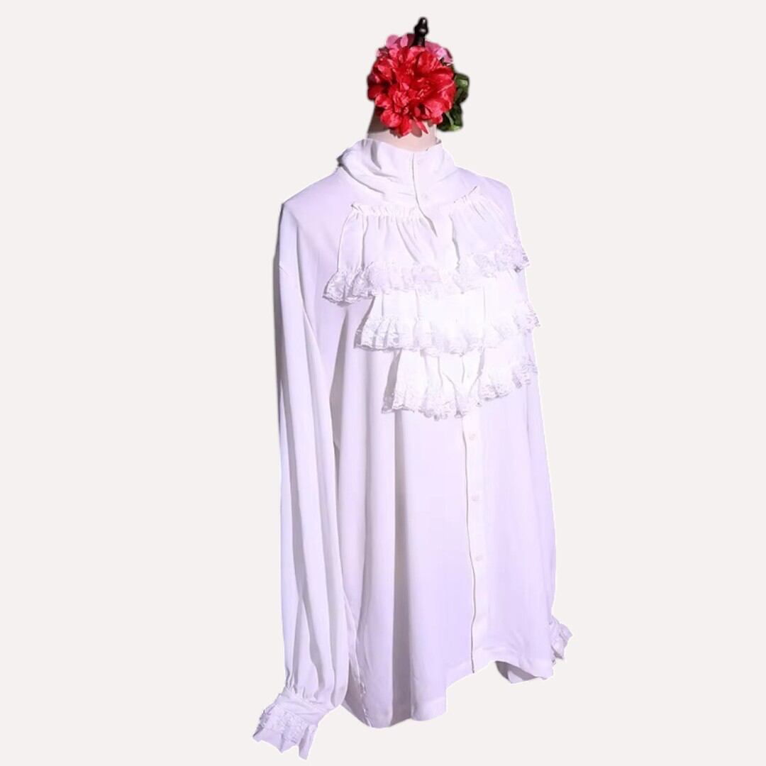 胸元から襟、袖口にもたっぷりのフリルがあしらわれたトップス