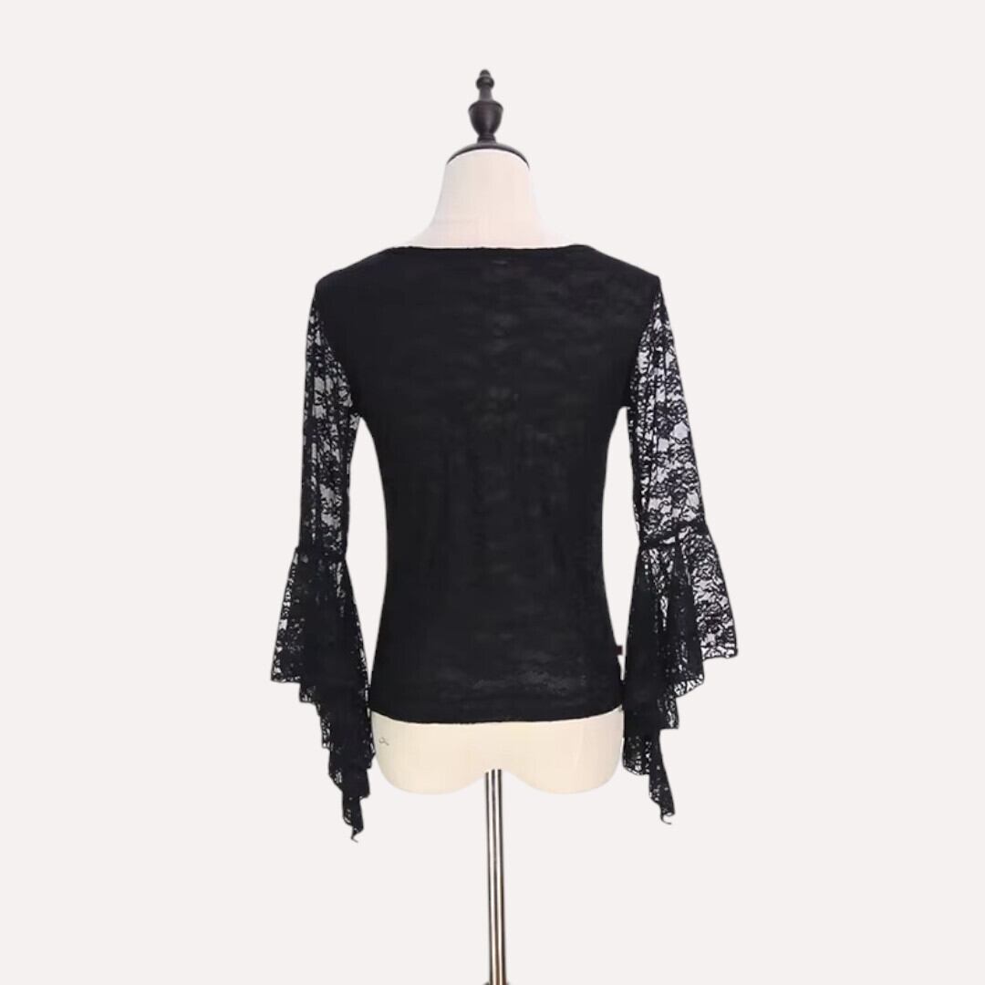 肩から胸元にかけてと袖の上部に繊細なブラックレース