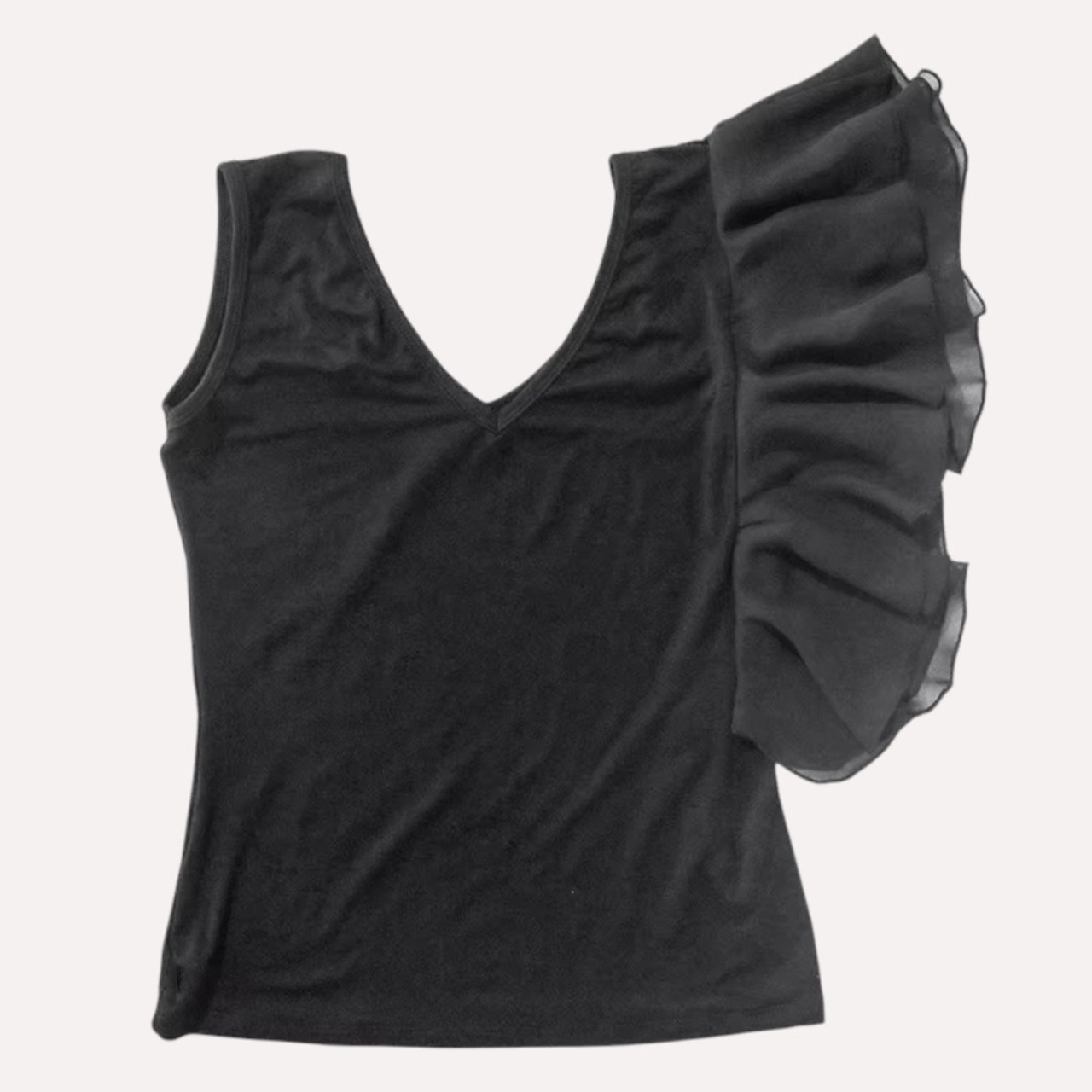 アシンメトリーなブラックフリルトップス